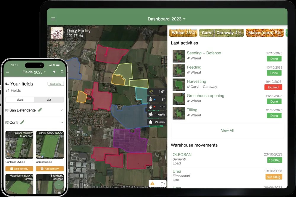 - Érzékelők: időjárás állomás, talajszenzorok, rovarcsapdák, PLC szenzorok, munkagép telemetria, gázolaj készlet, termény nyilvántartás stb.